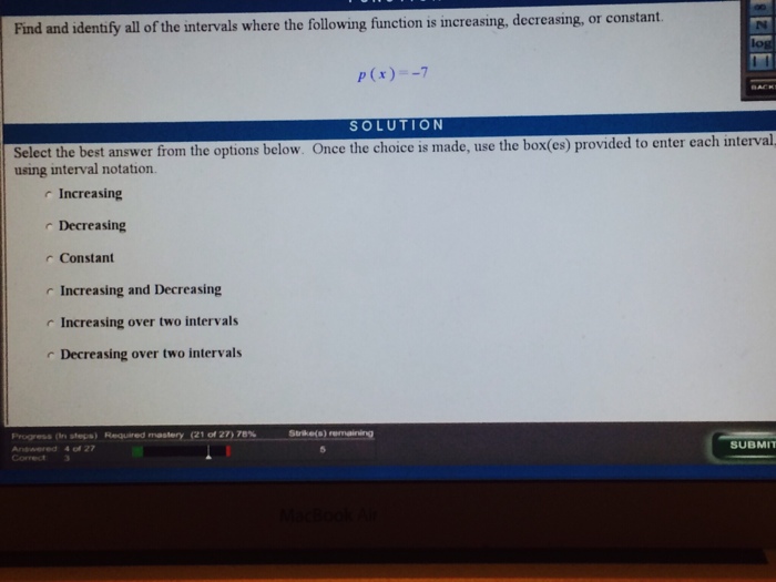 G (x) = e t where t = s i n (x). How to find increasing interval? Hence this is the increasing interval of the quadratic function and is written as (2,+∞). What does interval increase mean? On the interval 0, 4 Ï€, indicate in interval notation when it is increasing and when it is decreasing. Jan 05, 2019 · for the function: Learn how to write interval notation for where functions increase, decrease, and are constant in this free math video tutorial by mario's math tutoring.0:21. In other words, while the function is decreasing, its slope would be negative. What are intervals of increase and decrease? You could name an interval where the function is positive and the slope is negative. The secret is paying attention to the exact words in the question. Notice that we always use parenthesis and not brackets when writing intervals. Using interval notation, determine the intervals over which the graph given below increases, decreases, or is constant.